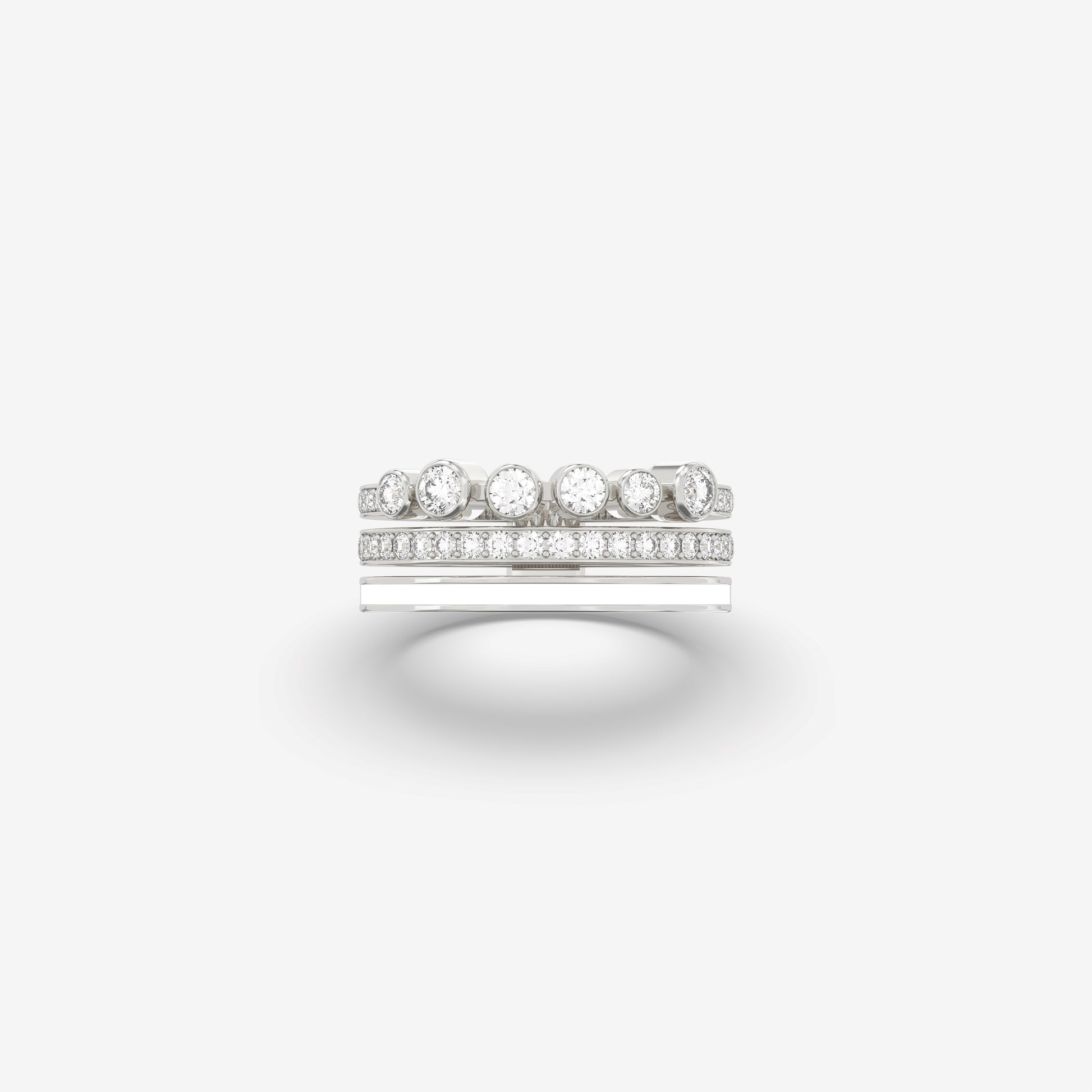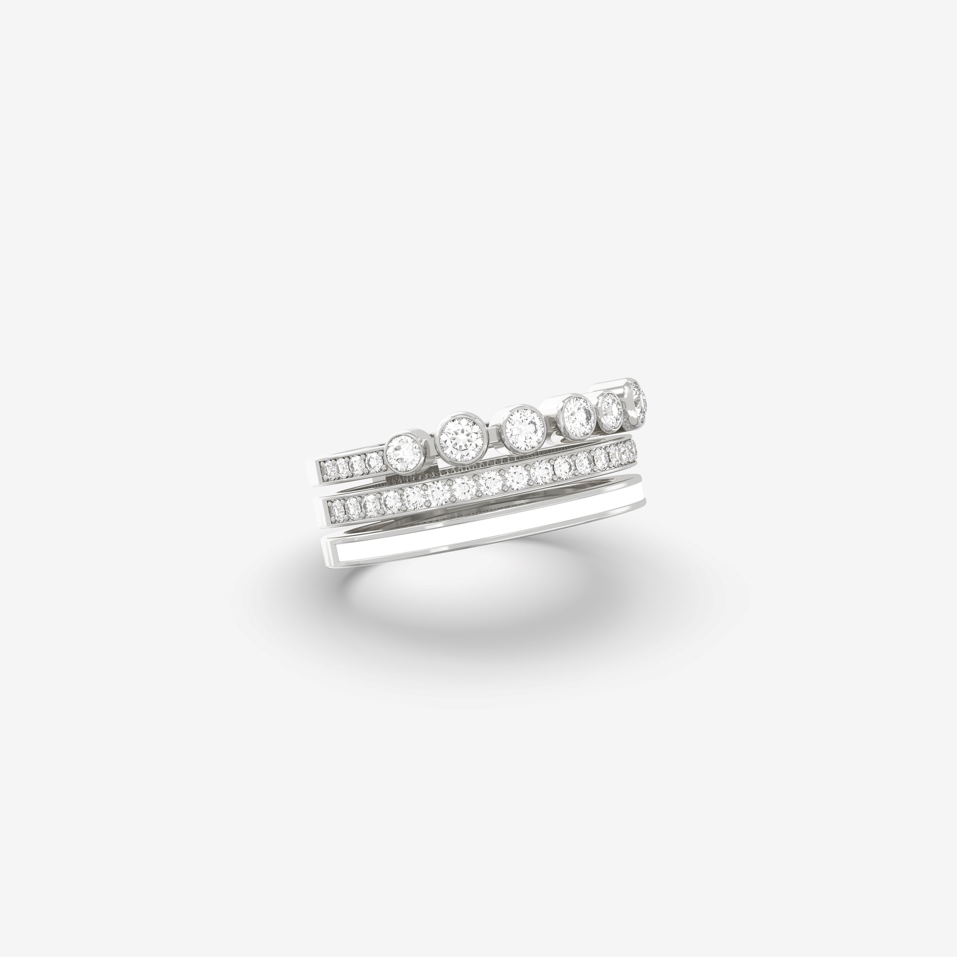 A blend of modern elegance, showcasing diamond bezels, white enamel, and pavé diamonds to create a beautiful piece.